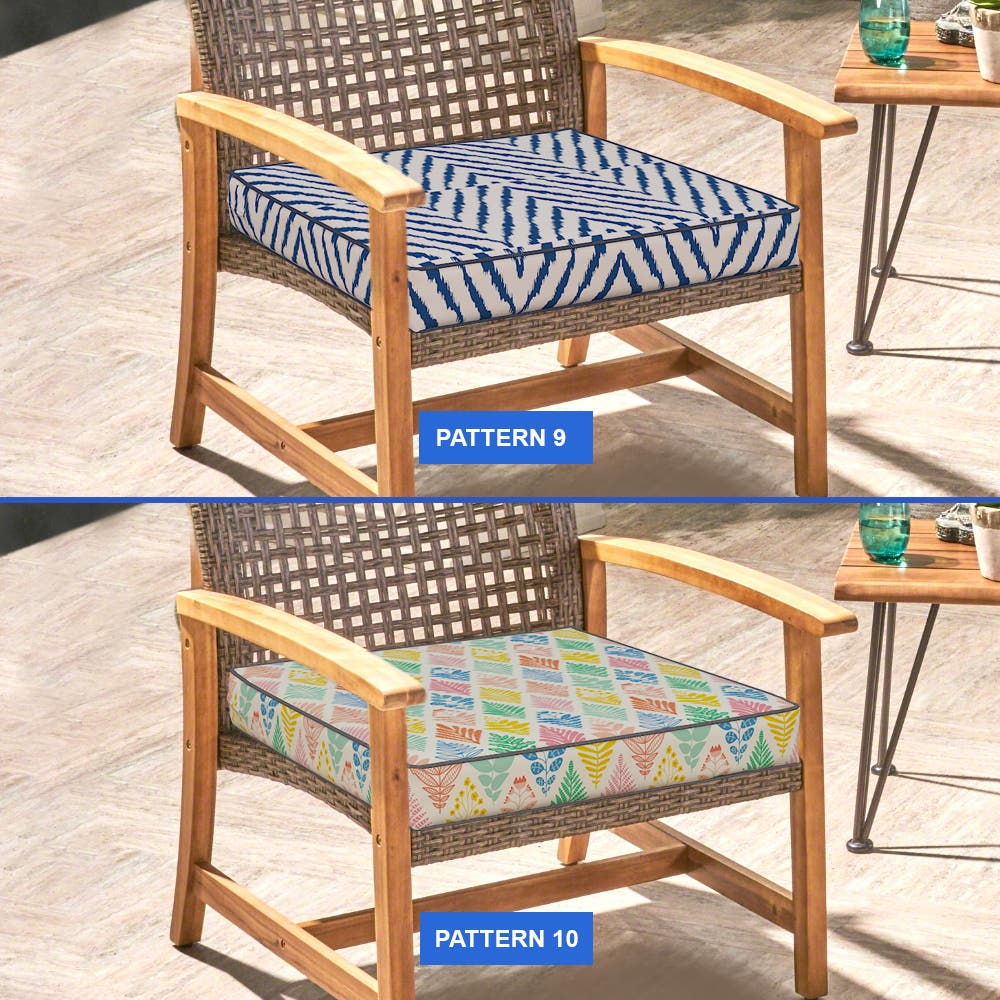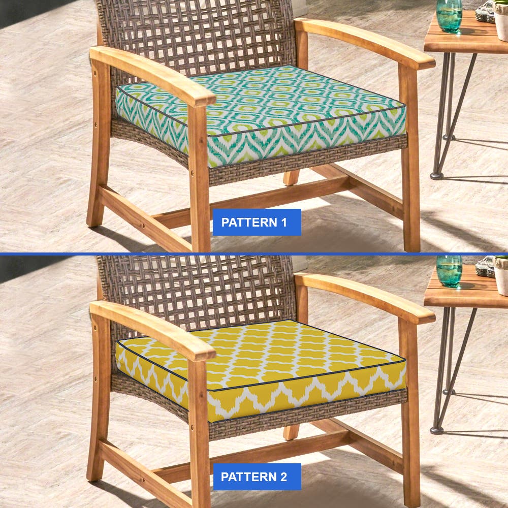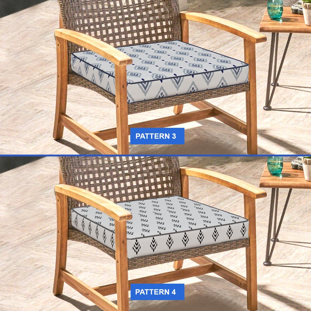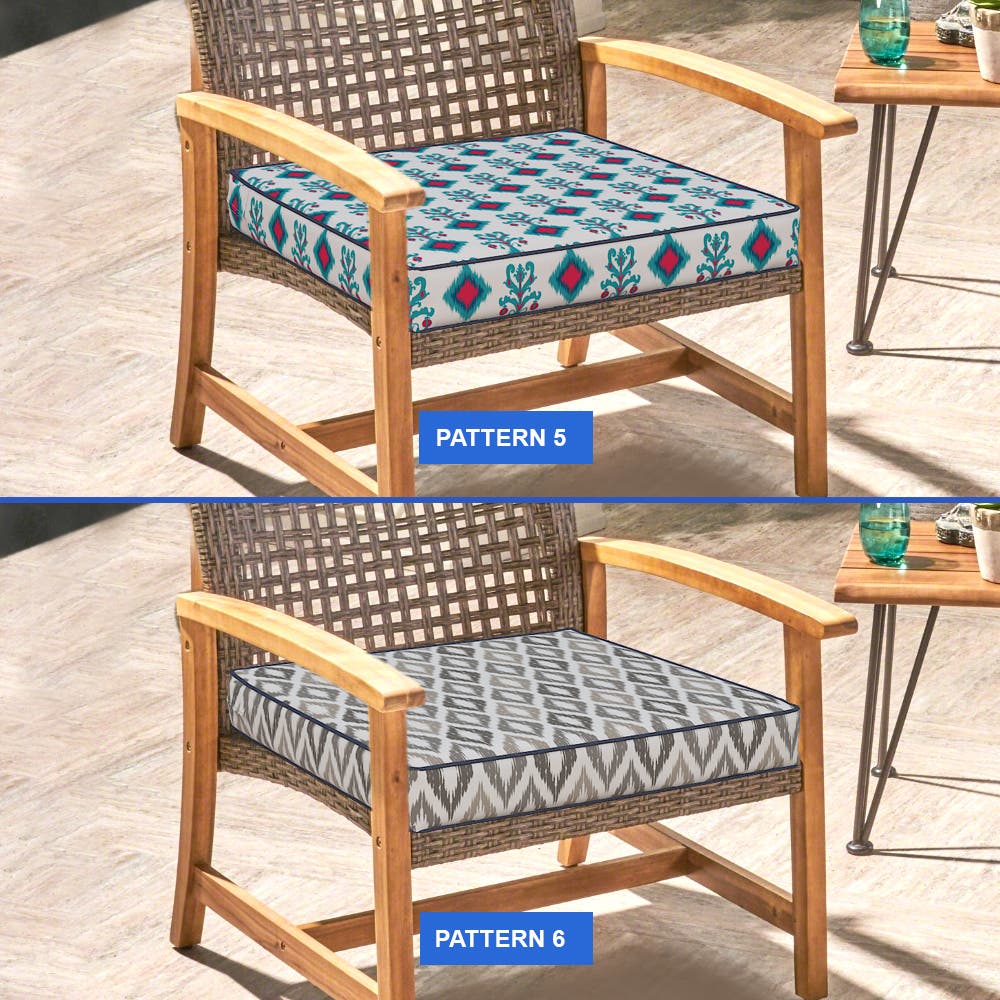Tailor your outdoor area with our custom-sized patio furniture cushion covers. Our accurate sizing guide helps you find the perfect fit, with a 0 to -2.5 cm allowance for precision. Pick from our Ikat pattern collection to match your outdoor style. Add ties in your preferred positions for a secure fit, or select a zipper for easy removal. Your custom outdoor cushion covers can also feature piped edges for a smart, finished look.