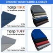 Choose from tarp max and tarp tuff for your round mound tarps. Tarp max, made from 1000 denier, 15 mil thick PVC coated polyester and weighing 407 GSM, is excellent for lighter climates and includes a three-year warranty. Tarp tuff, ideal for severe weather, is 18 mil thick, weighs 610 GSM, and comes with a five-year warranty, perfect for our weather-resistant weighted tarps.
