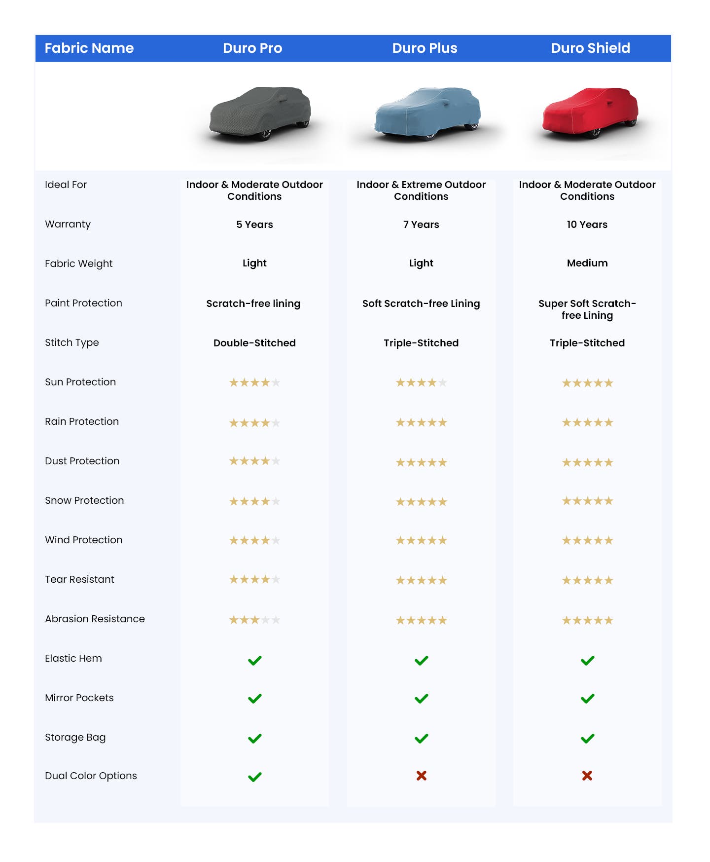 Since each of our covers is made-to-order, it ensures complete coverage of all sharp body lines, contours & curves. Our precisely cut patterns are designed to accommodate & cover the facelift variations of all models & makes.