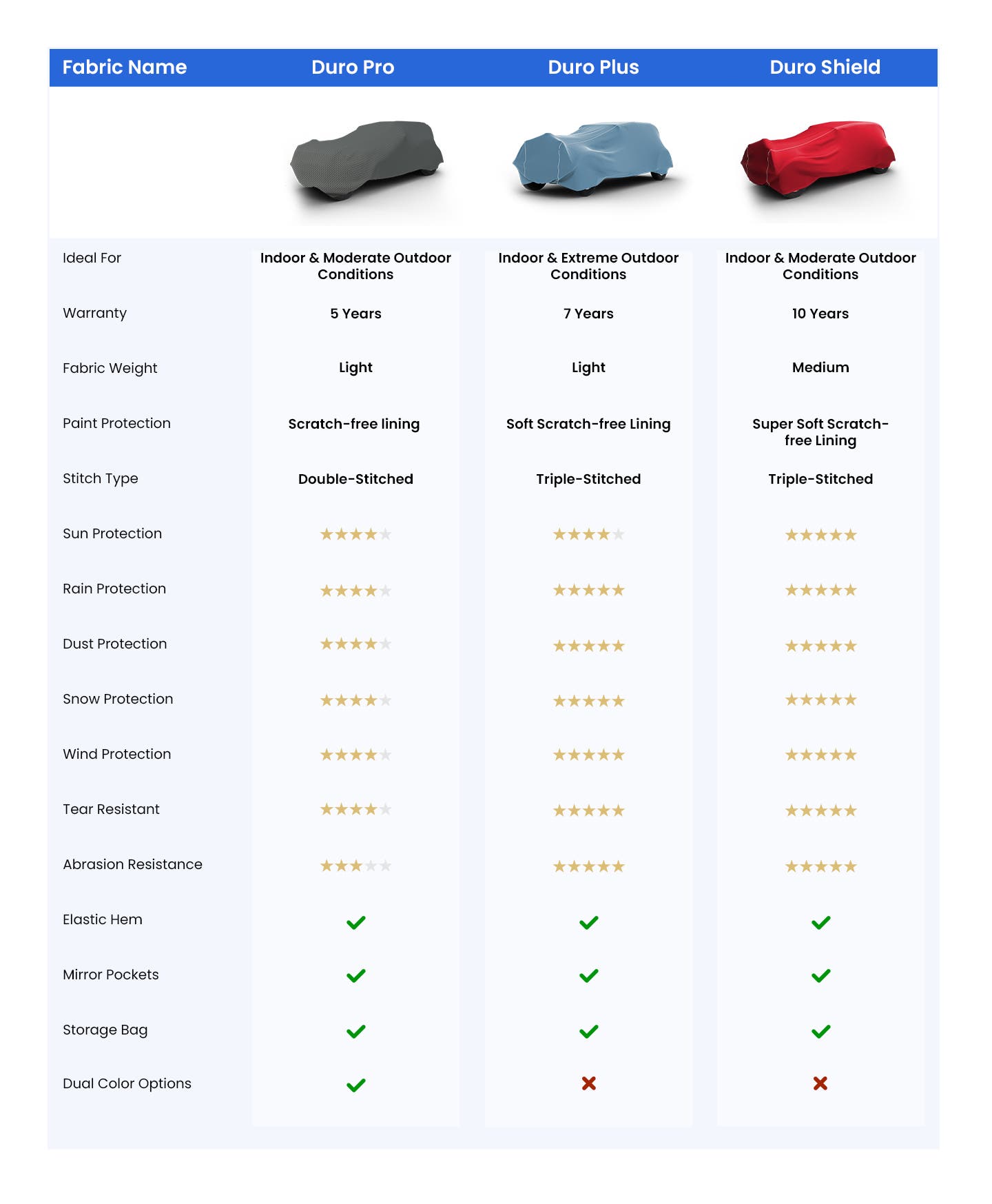 Since each of our covers is made-to-order, it ensures complete coverage of all sharp body lines, contours & curves. Our precisely cut patterns are designed to accommodate & cover the facelift variations of all models & makes.