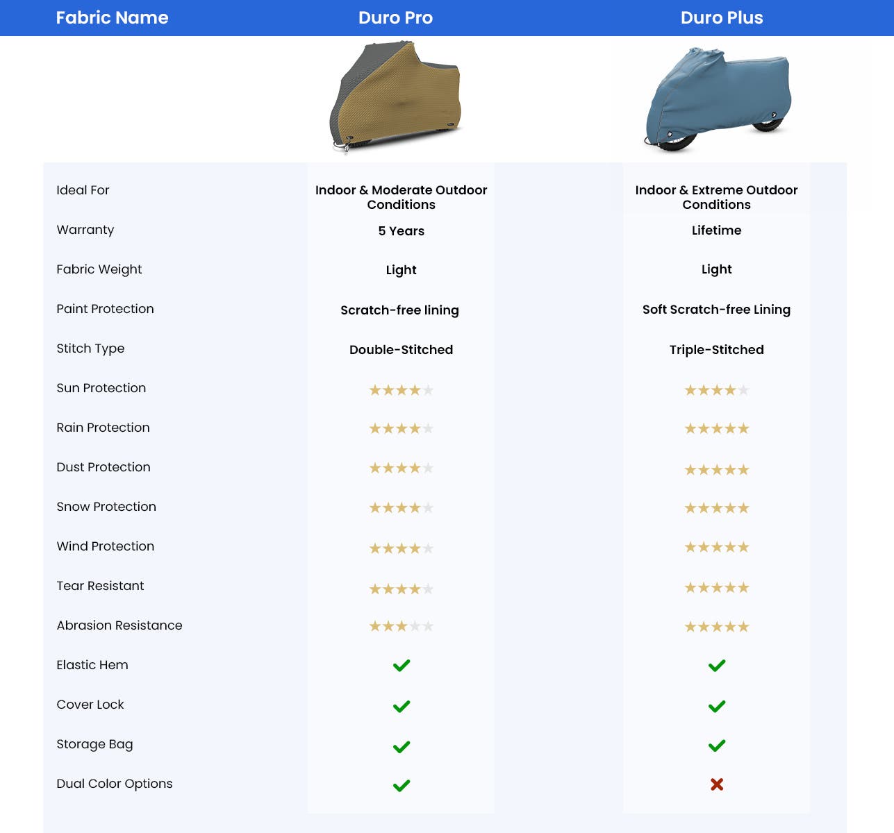 Our made-to-order covers are available with premium double-stitched seams. The double stitch seams not only ensure a great fit with full coverage, but also enhace the durability for long-lasting protection.